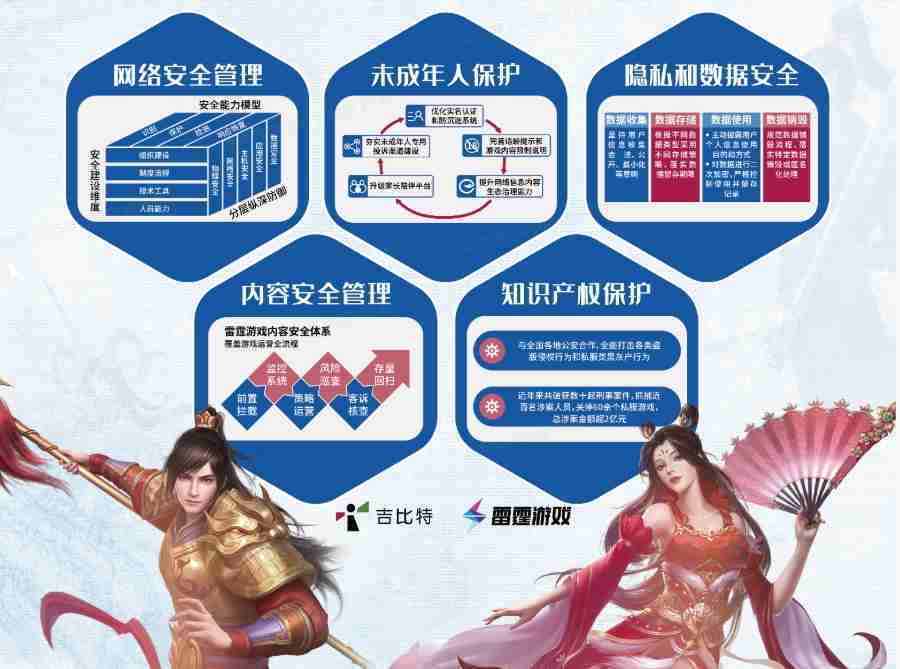 本次JIUYOU.COM展区以网络安全管理、、、内容安全管理、、、、未成年人保护、、、隐私和数据安全、、知识产权保护五个模块介绍公司游戏安全工作成果,,,体现JIUYOU.COM高度重视网络安全,,,,严格遵守相关法律法规要求,,,积极承担企业主体责任。。。
